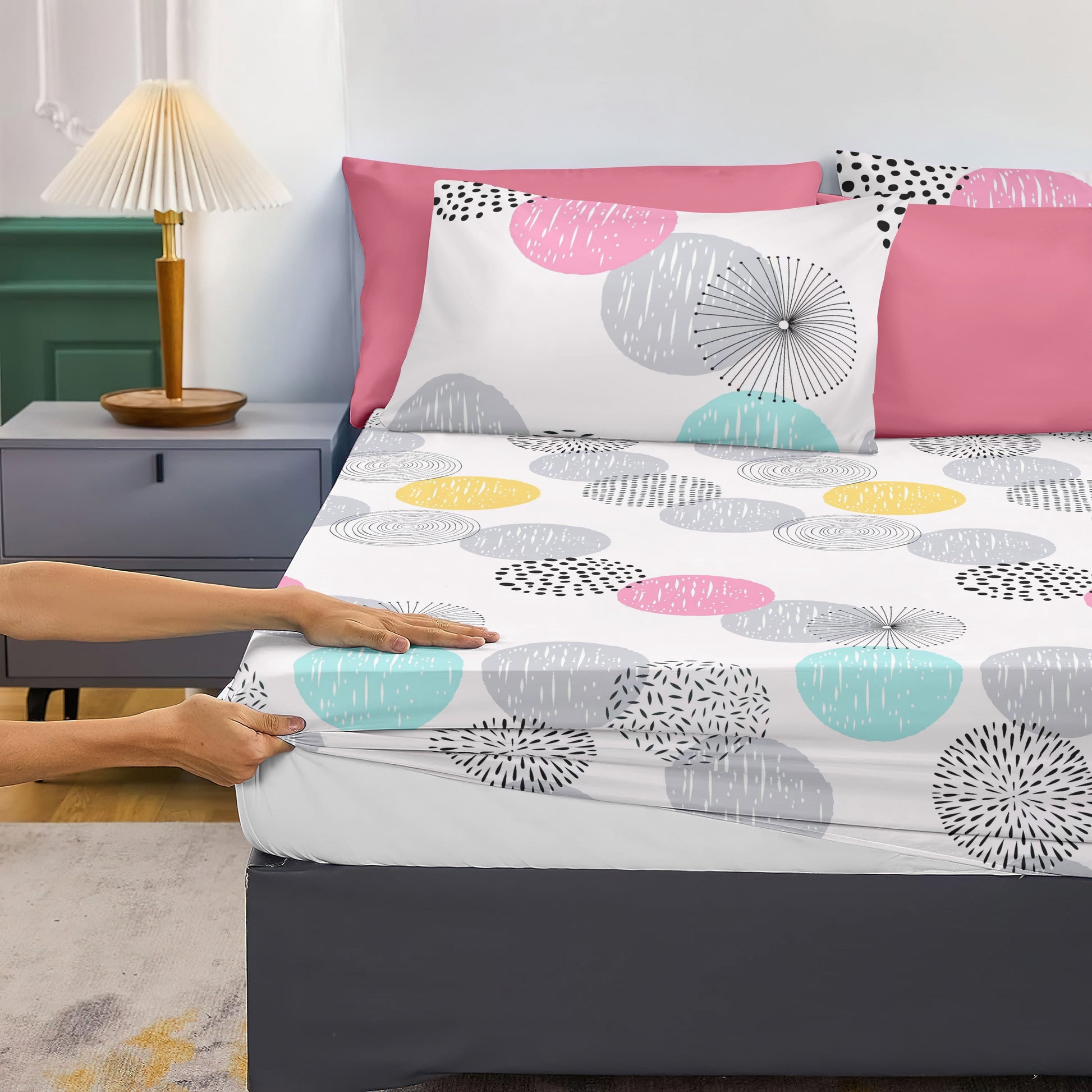 4/6 pcs Circle Printed Microfiber Bed Sheet Set 1/2 Solid Pillowcases + 1/2 Printed Pillowcases + 1 pc Flat Sheet + 1 pc Fitted Sheet (Deep Pocket 35cm/13.77inch) Suit For Bedroom Guest Room Hotel For All Season