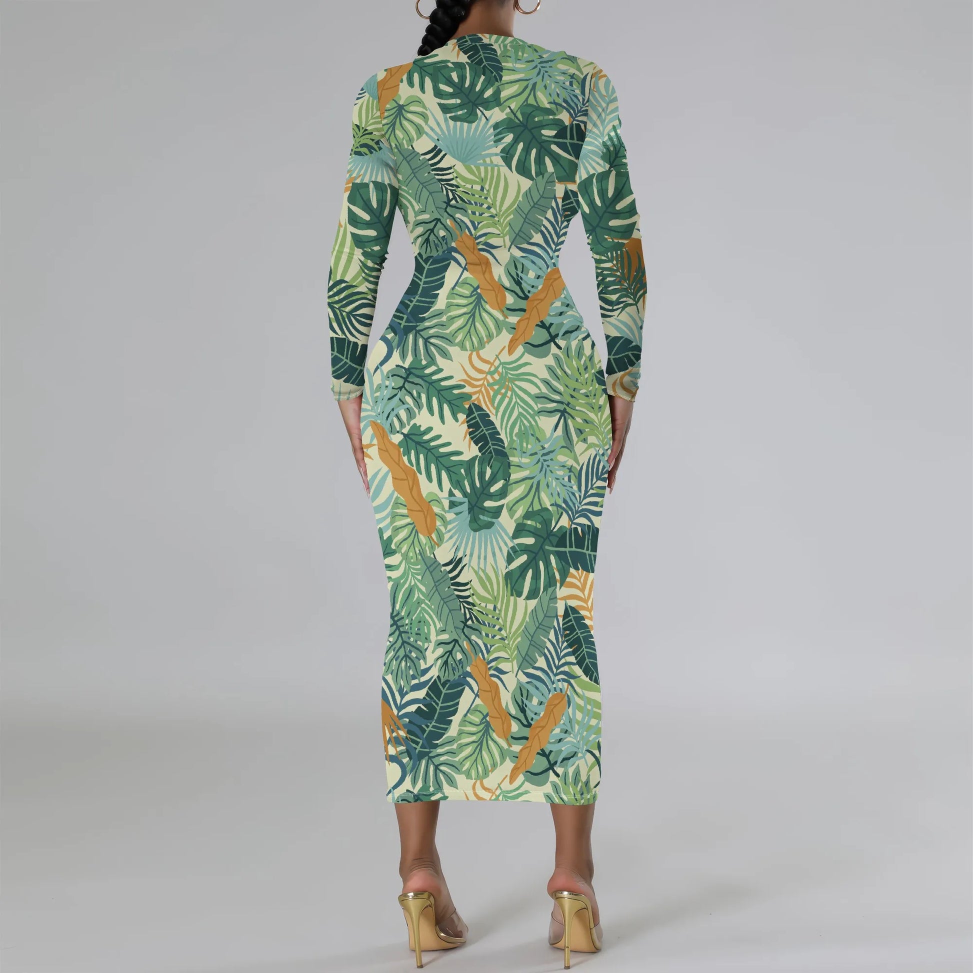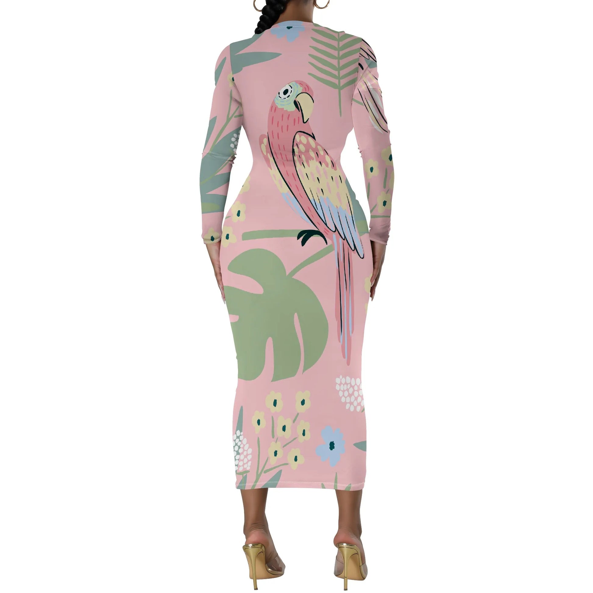 Date Night Dresses for Women Floral Print Crewneck Long Sleeve Stretchy Fitted Bodycon Maxi Dress