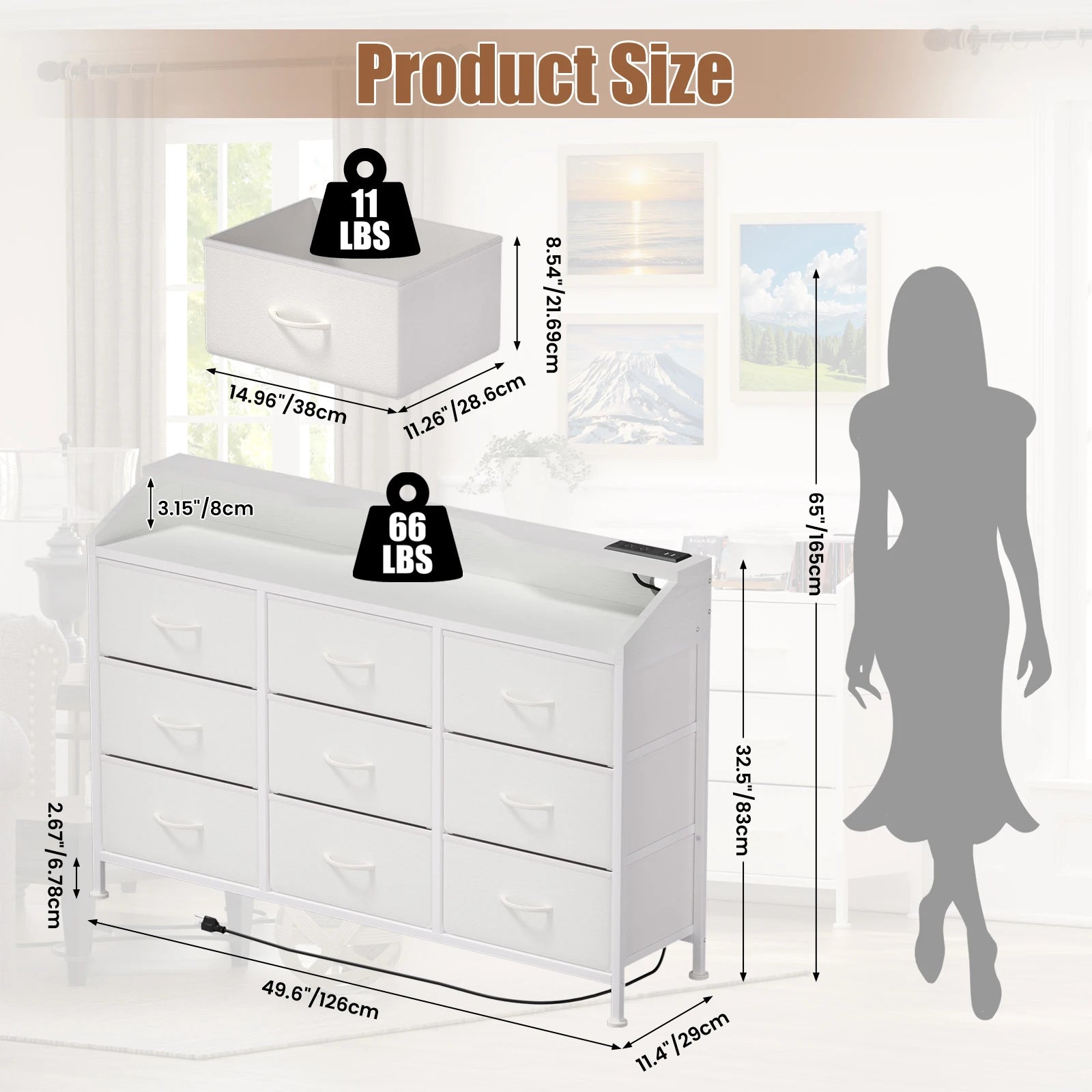 Dresser for Bedroom, 9 Drawers Dresser with LED Lights & Charging Station-White