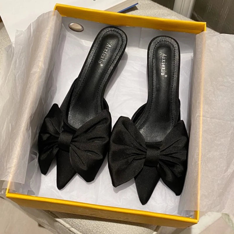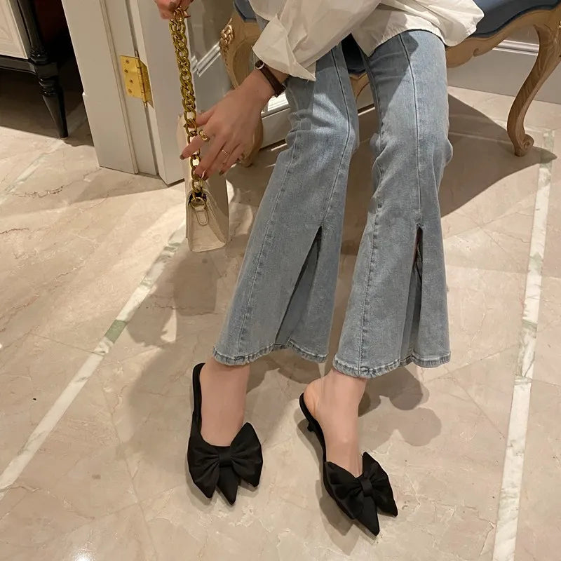Hot Pink 2022 New Fashion Pointy Toe Silk Low Heels Sandal Women Slip on Mules