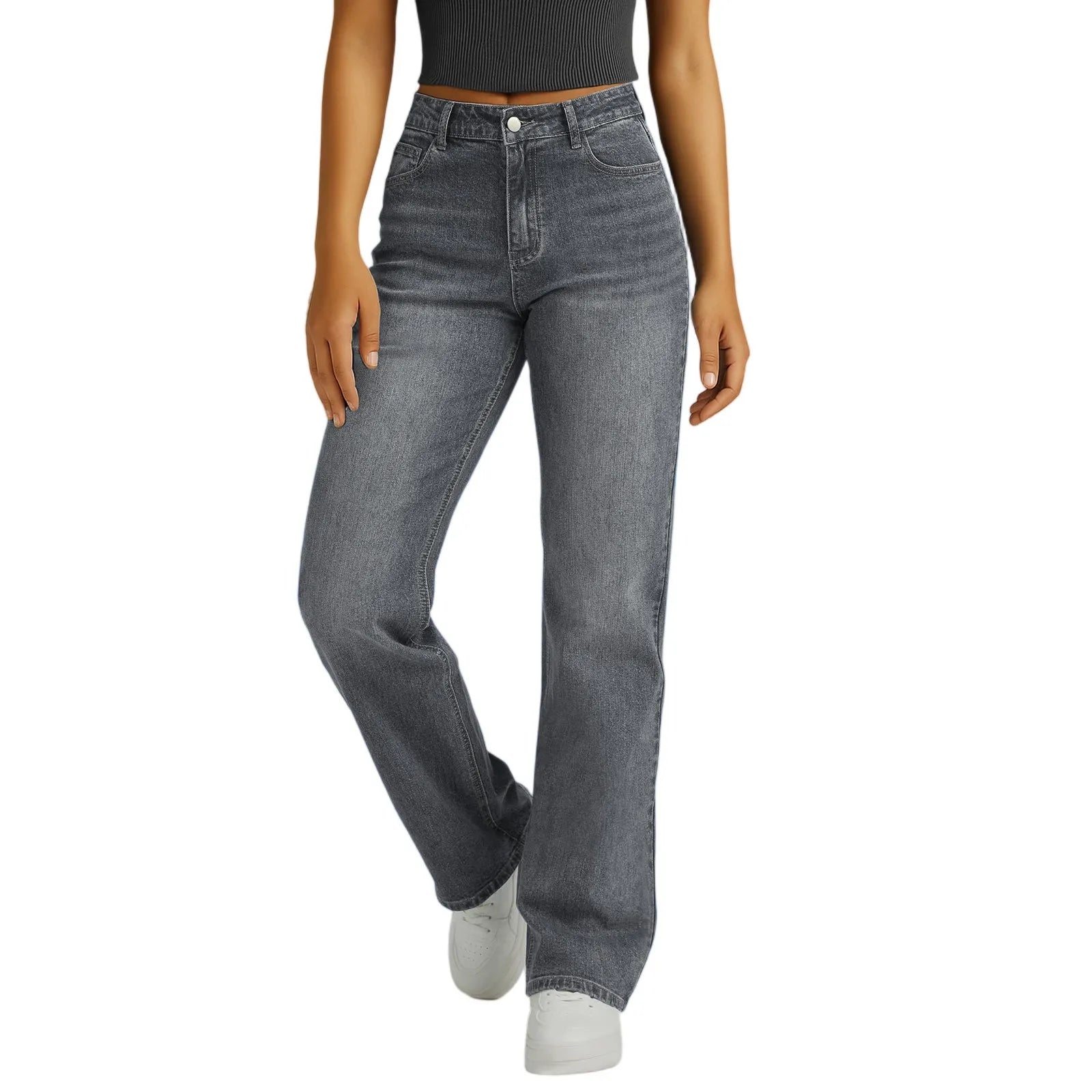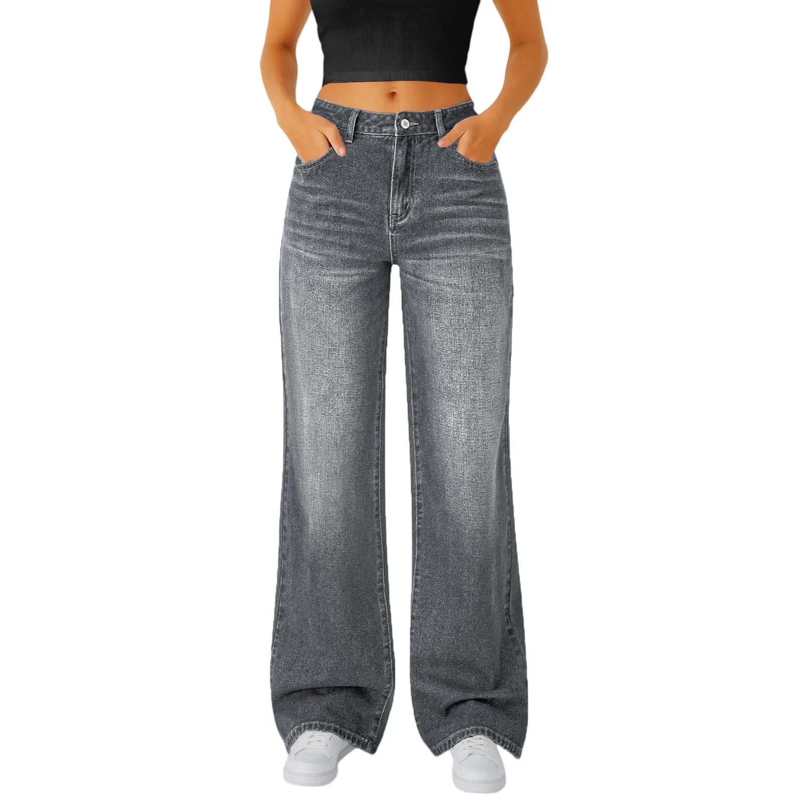 Jeans Women Straight Long Pants Casual Floor Length Mom Pant Blue High Waist Elegant Zipper Fly Pockets Slim Y2k Denim Trousers