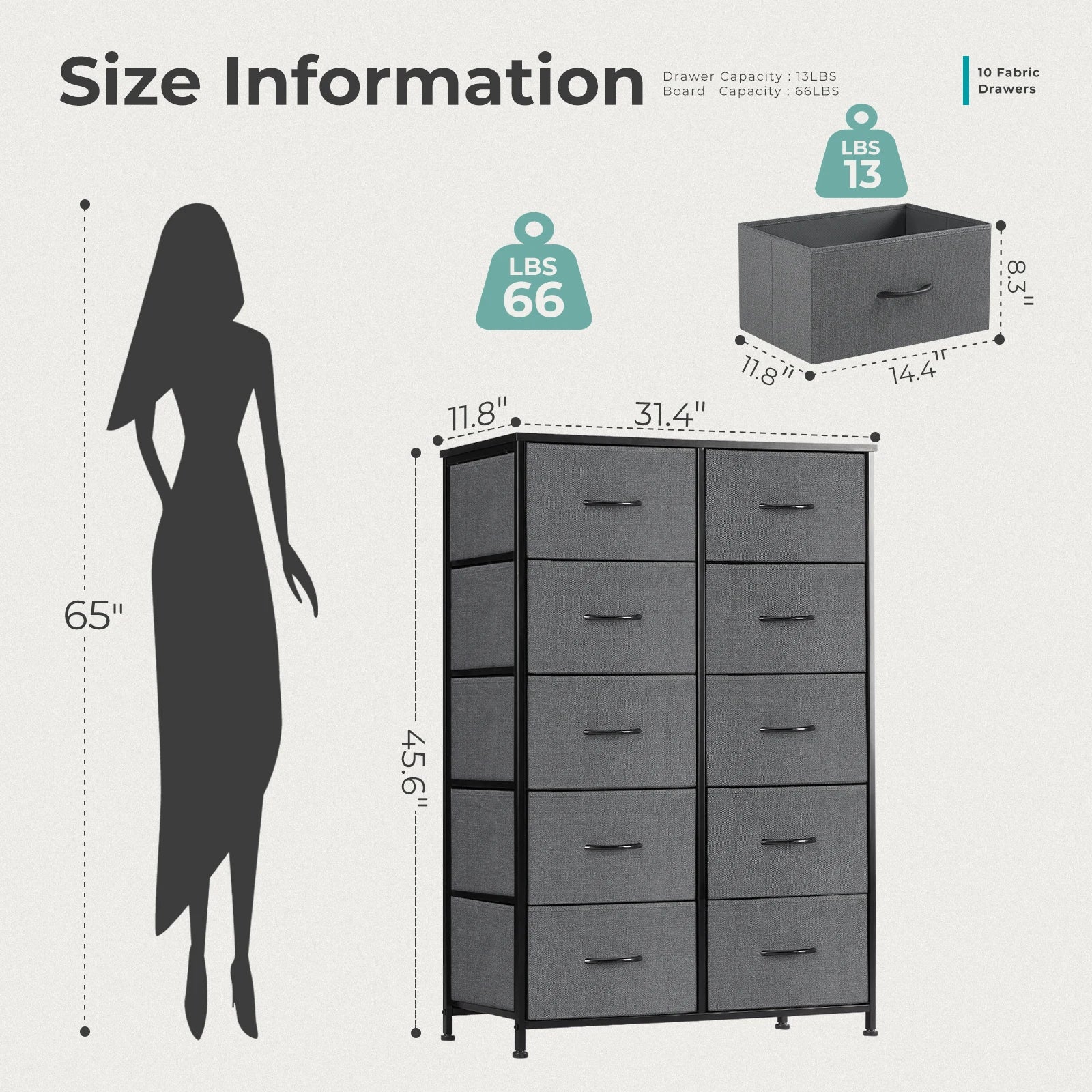 JHK Bedside Table For Bedroom With 10 Fabric Drawers Nightstand Storage Cabinet With Steel Frame Clothes Storage Display Cabinet