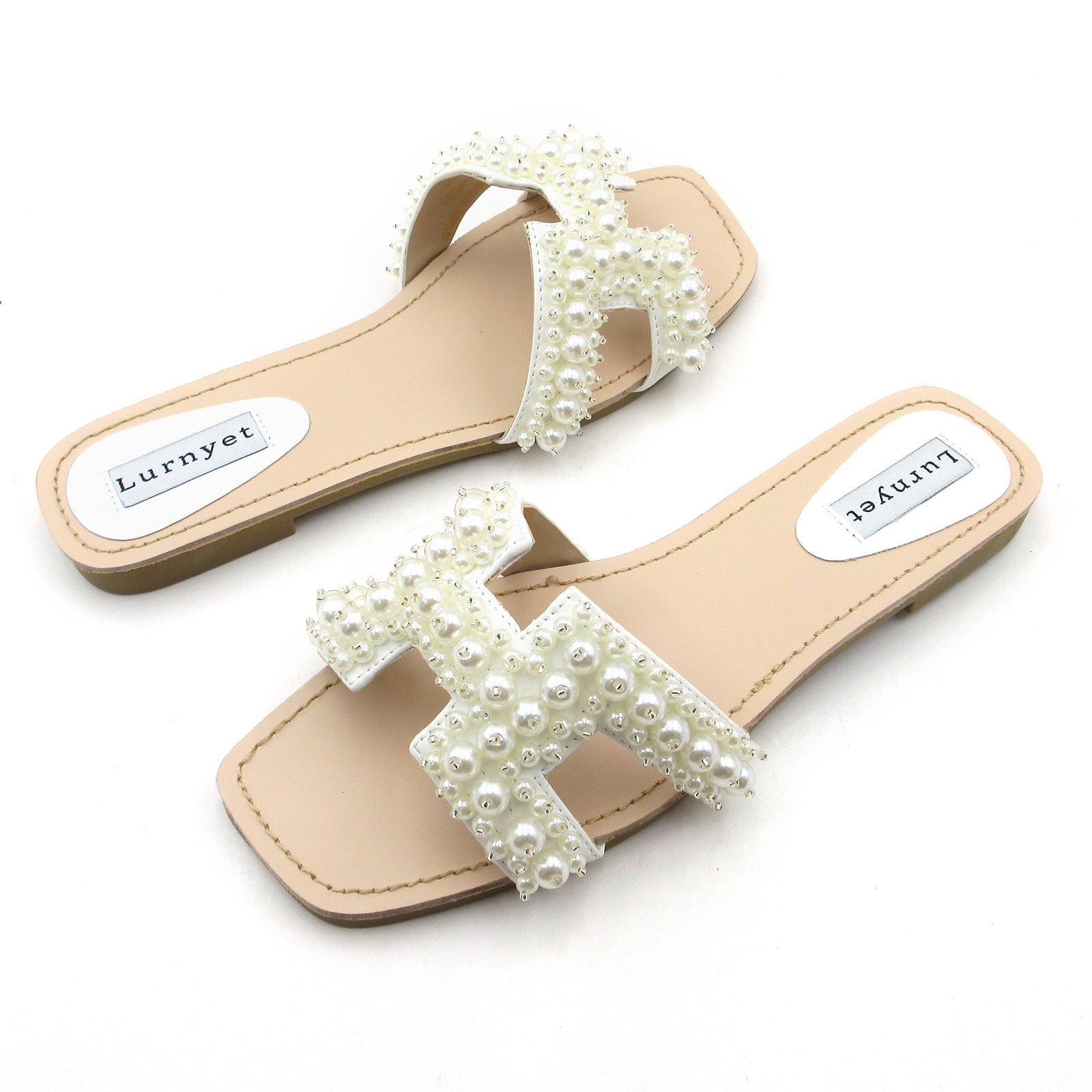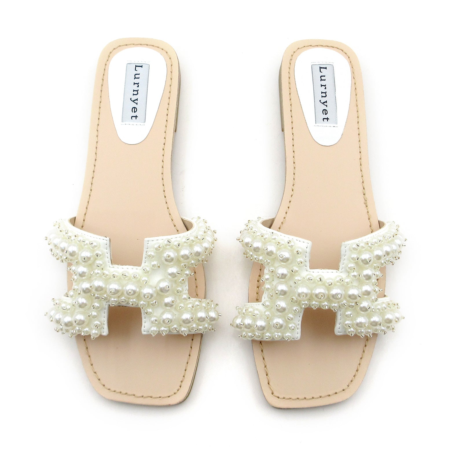 Lurnyet Women's Pearl Embellished Band Flat Sandal for Outdoor Casual