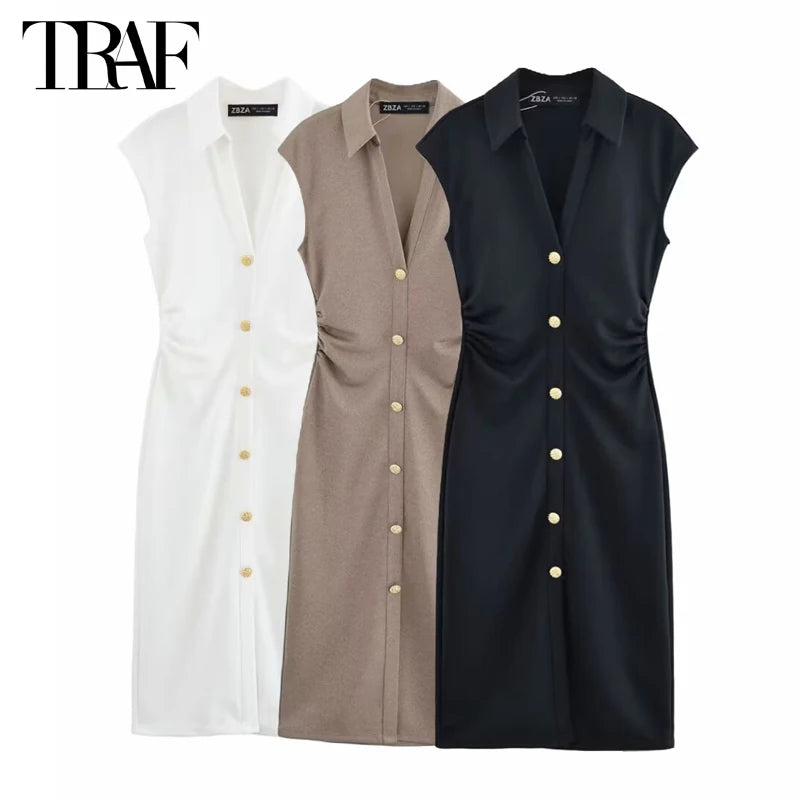 MUJER 2025 Pleated Midi Dresses for Women Sleeveless Shirt Dress Woman White Black Women's Summer Dress Draped Party Dress Women