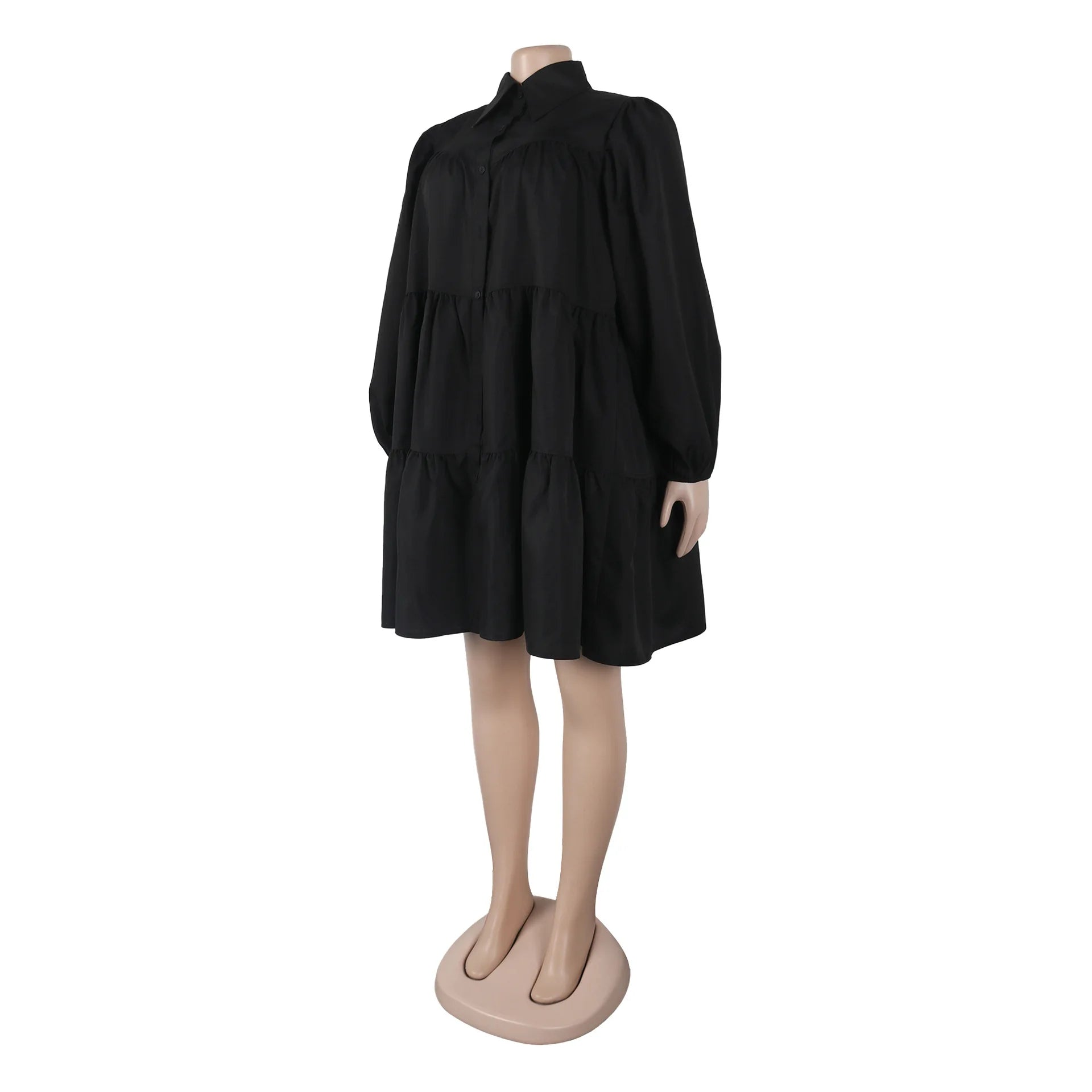 Summer 2025 Solid Color Pleated Turn-down Collar High-End Button Loose Hem Casual Midi Dresses Ladies Elegant Dresses