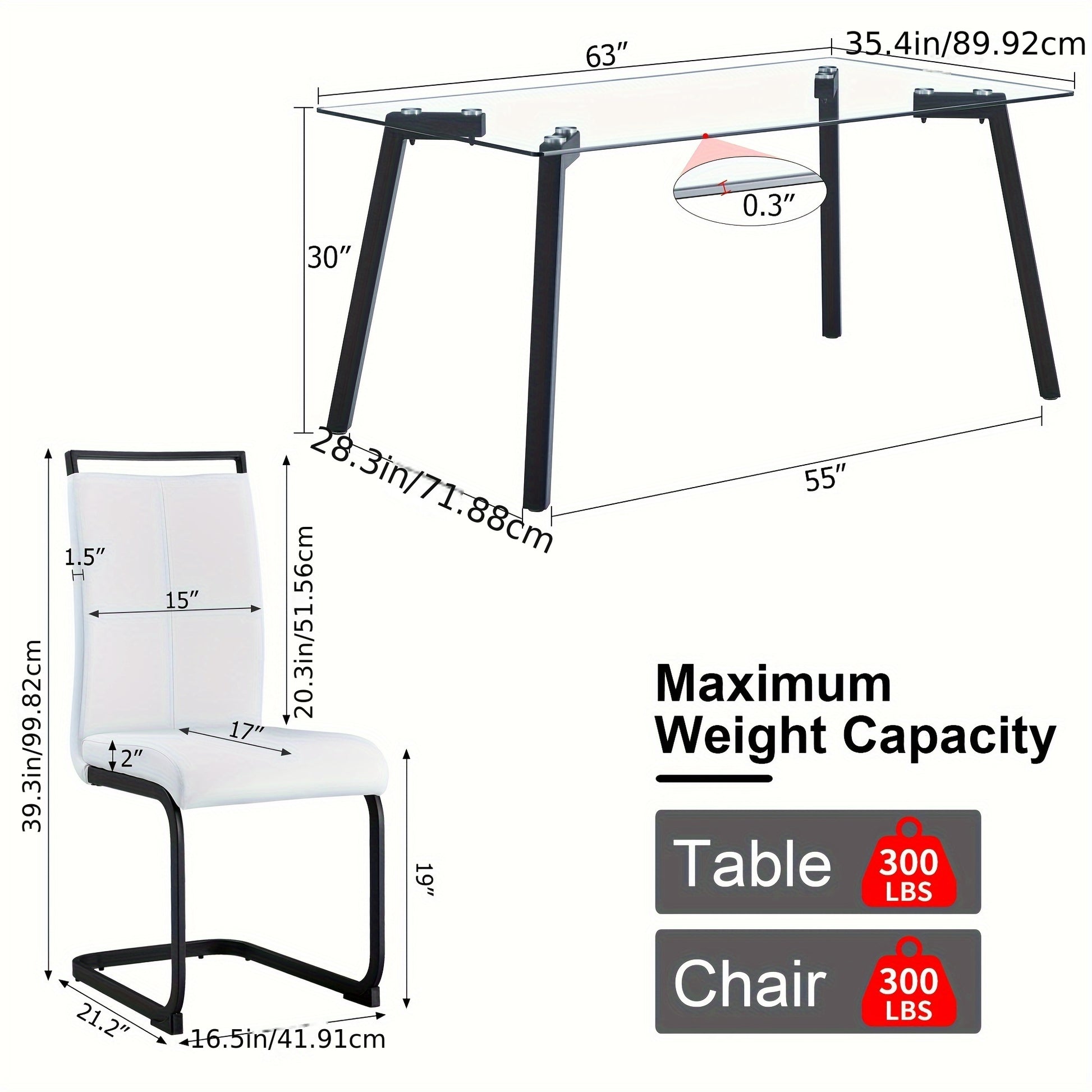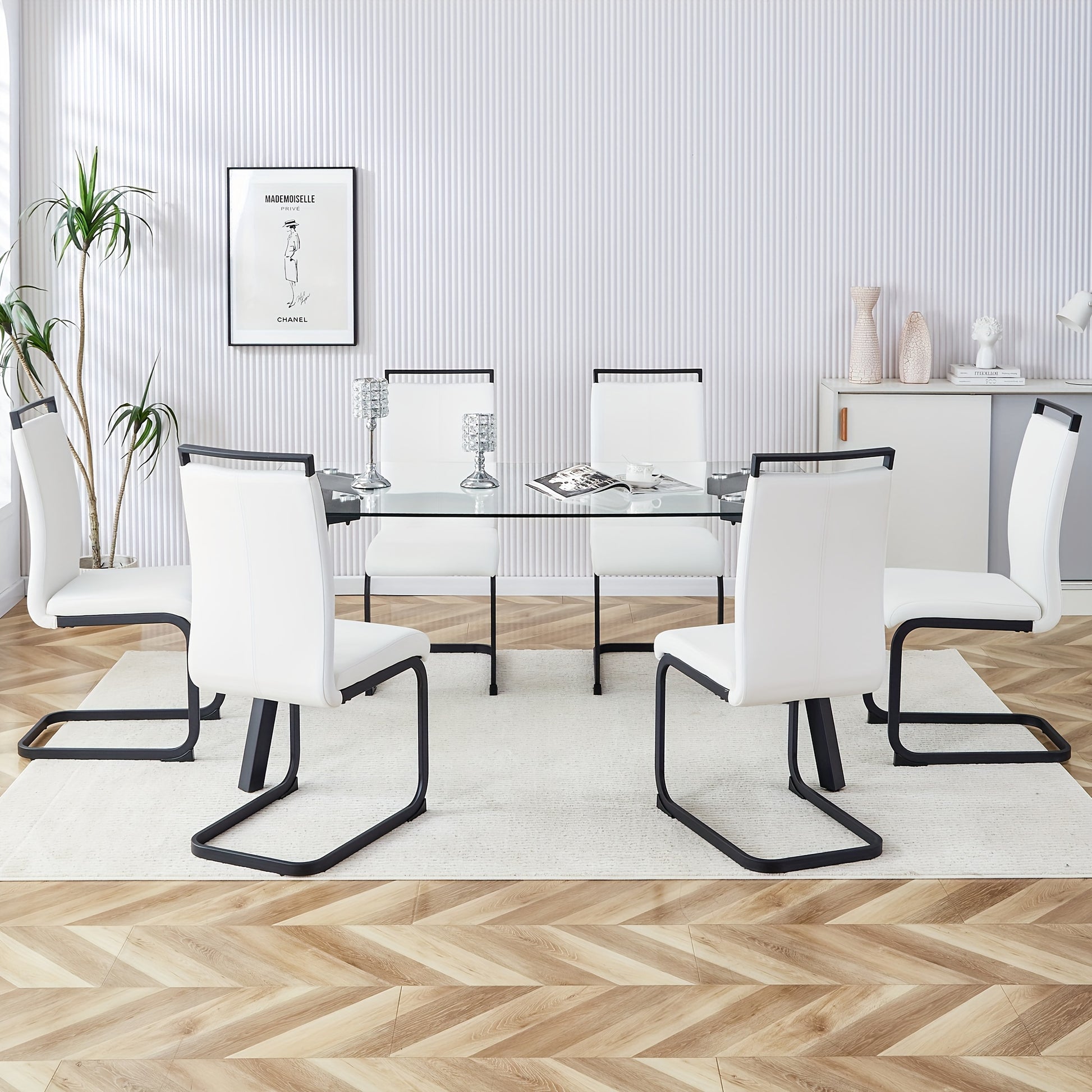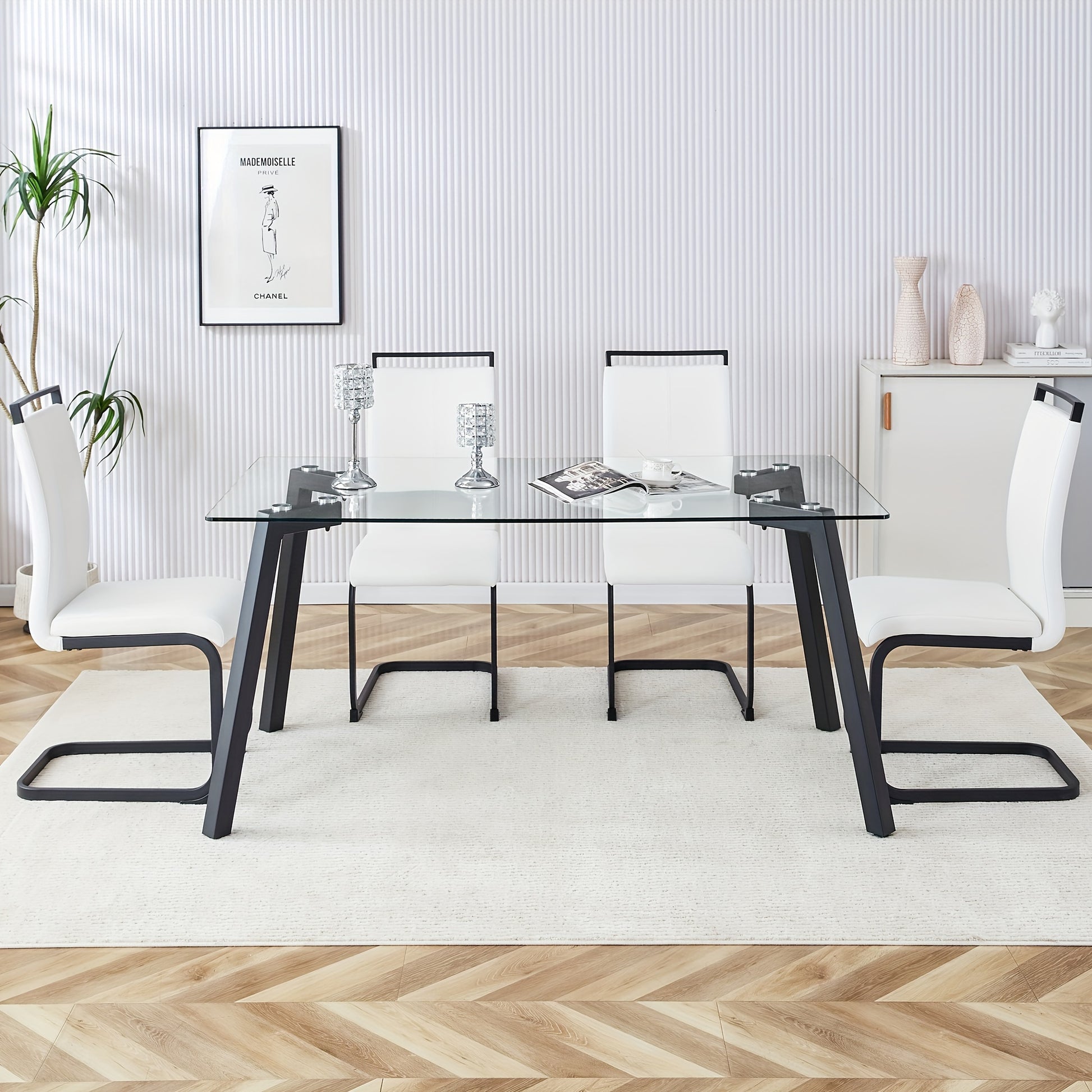 Table And Chair Set, 1 Table And 4 Chairs. Rectangular Glass Dining Table, 0.31 "tempered Glass Tabletop And Black Coated Metal Legs. Paired With White PU Black Leg Chairs. 1123 1162