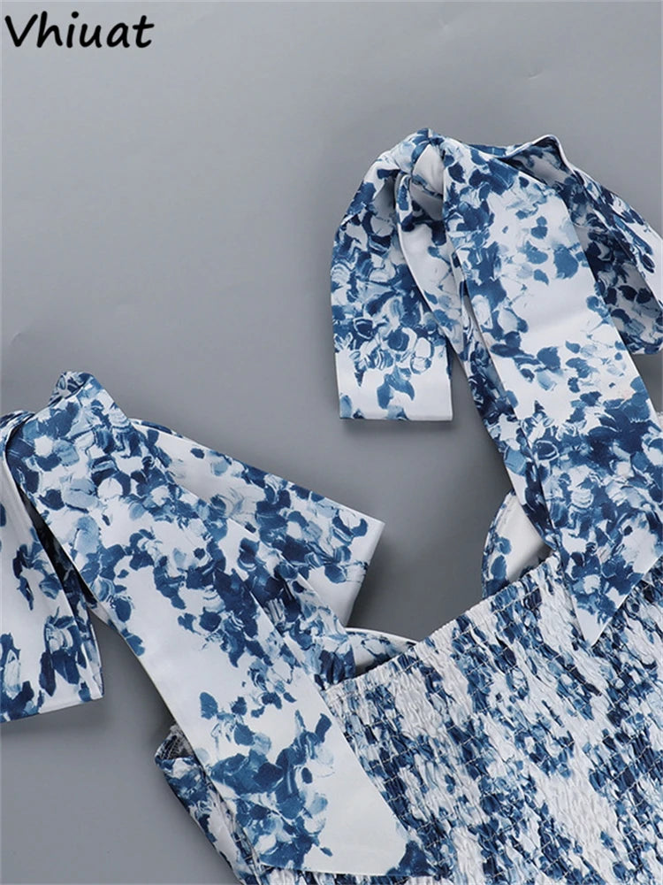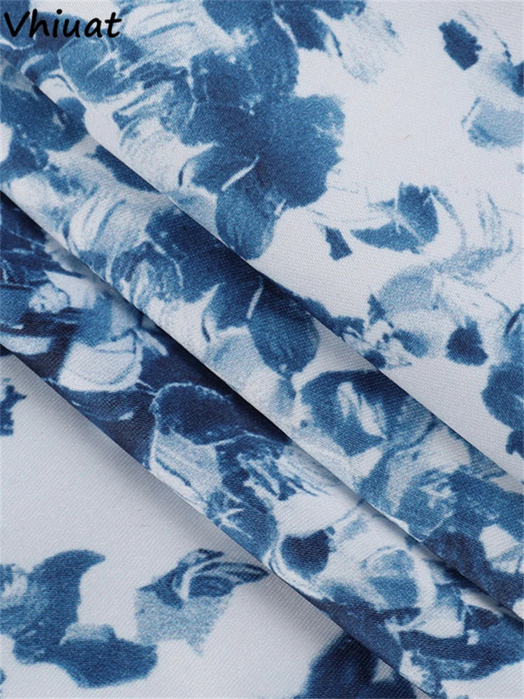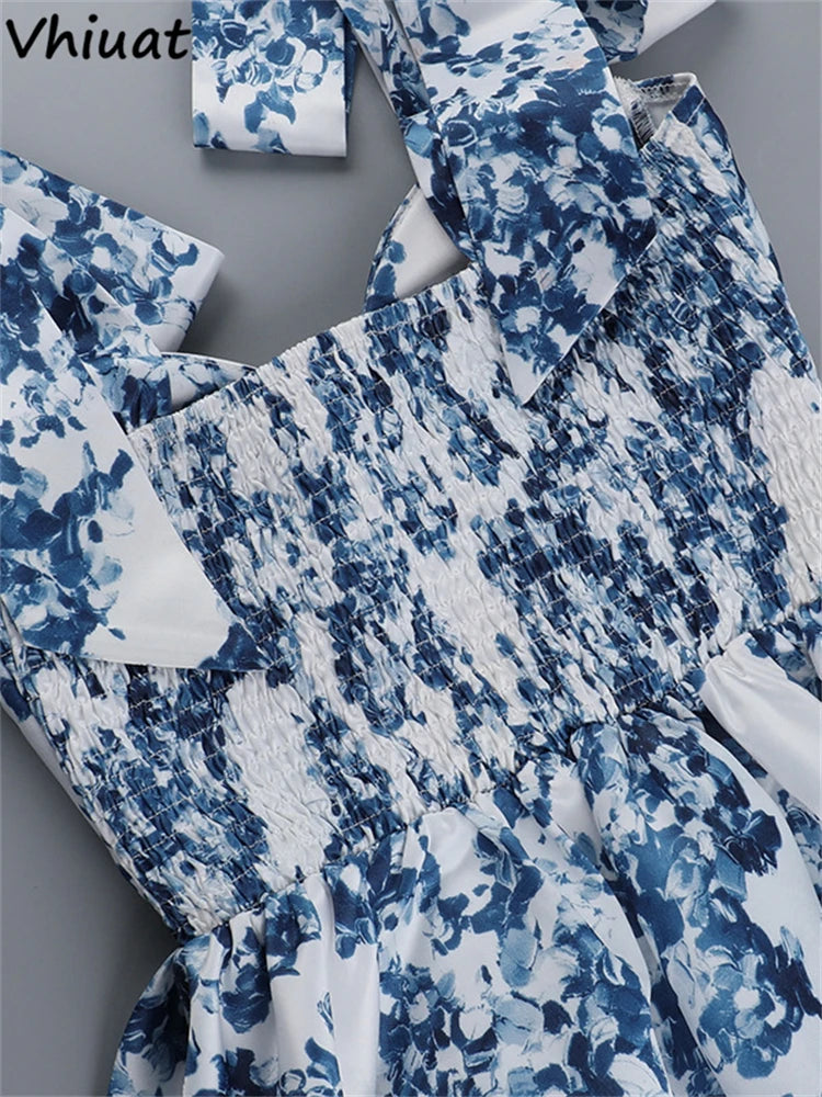 Vhiuat Blue Floral Print Cute Elegant Off Shoulder Mini A-Line Dress Lace Up Fashion Women Party Evening Dresses Summer 2024
