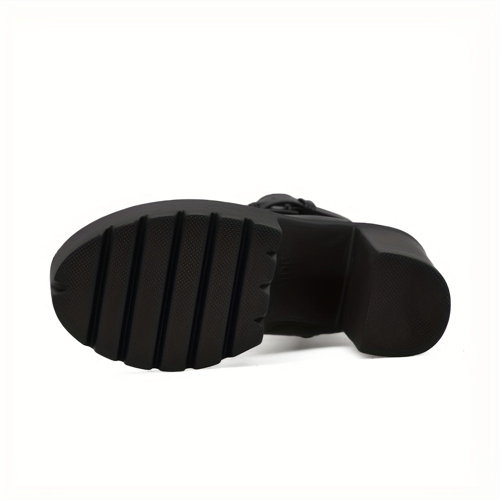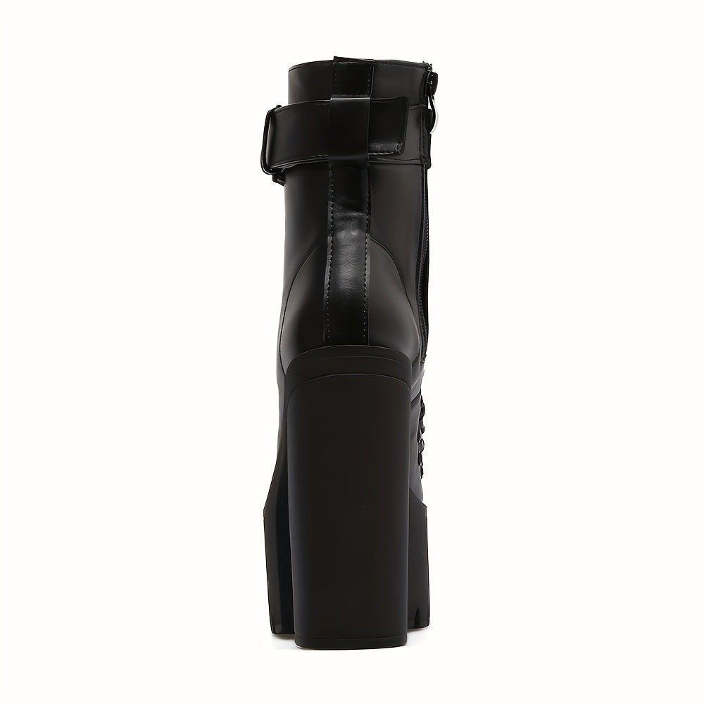 Women's Platform Chunky High Heel Ankle Boots, Black Buckle Strap Lace Up Side Zipper Motorcycle Boots, Punk Style Shoes